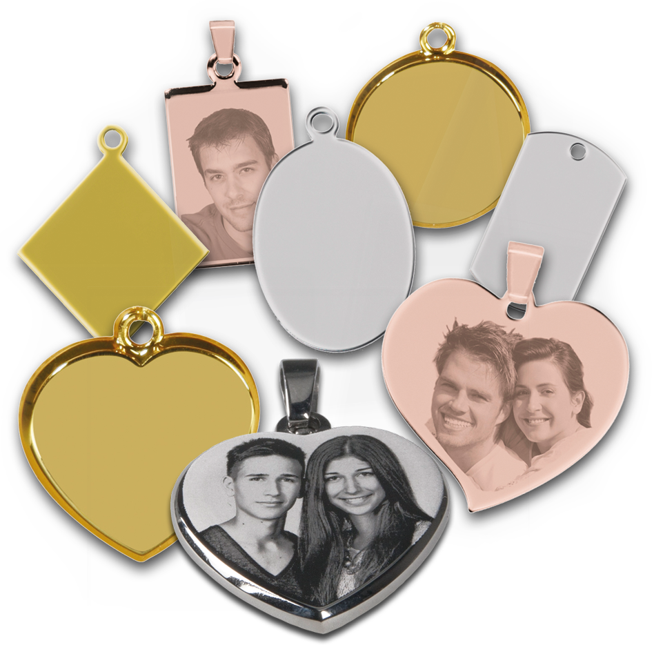 Diese gravierten Anhänger verschiedener Formen sind aus hochwertigem silber-, gold- und teilweise roséglänzendem Metall.